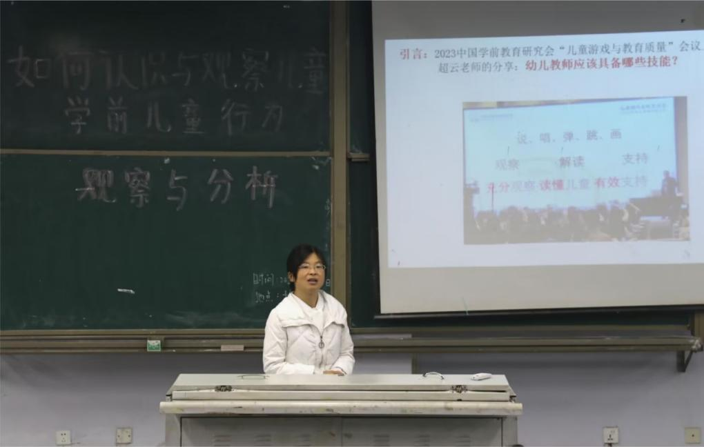 为进一步提升公司学前教育专业员工师范技能,2023年11月21日16:20,我院在博文楼111教室开展“如何认识与观察儿童——学前儿童行为观察与分析”专题讲座。2021级5班、6班全体同学参加本次讲座,学前教育专业教研室主任王冬梅老师主讲。