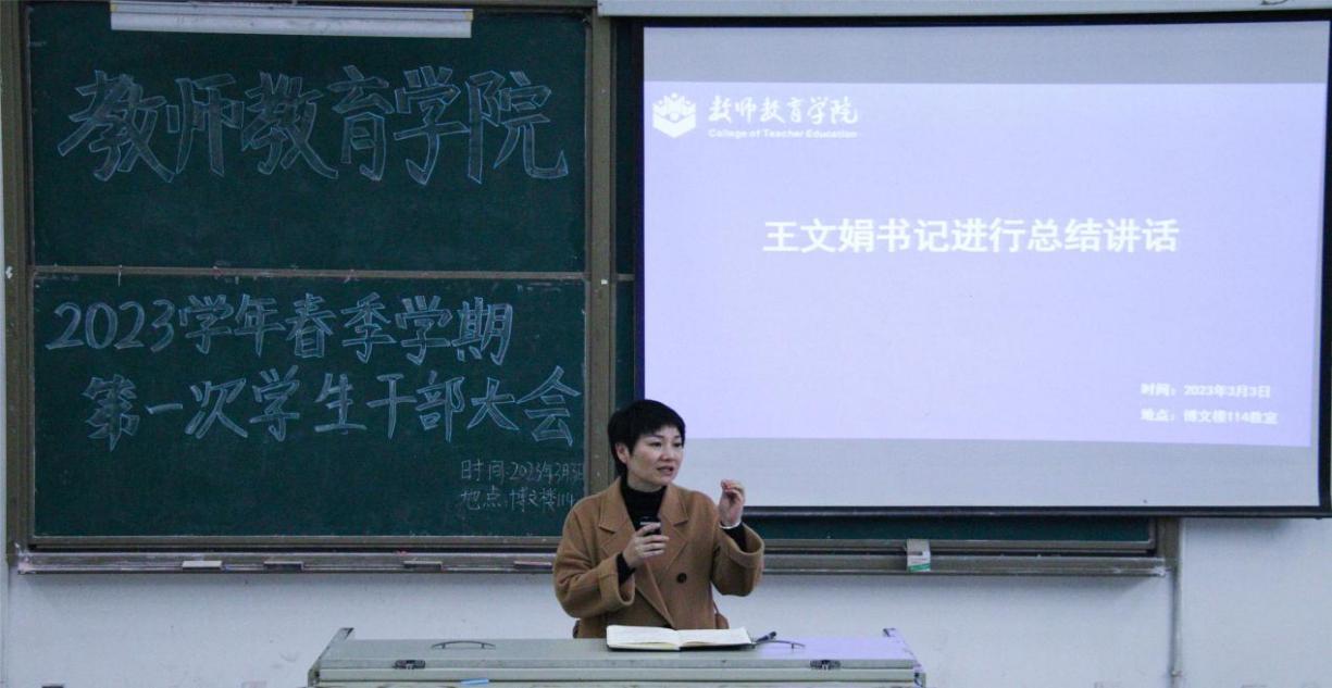 为进一步加强公司员工干部队伍建设,增强员工干部自我管理、自我服务与履职尽责能力,2023年3月3日下午,太阳成集团tyc151cc在博文楼114教室召开2023学年春季学期员工干部大会,公司党总支副书记王文娟、学工办副主任文娟、专职辅导员洪双、赵会辉、杨文明、魏靖,团总支员工会各部门部长及各班班长参加了此次会议。本次会议由文娟老师主持。